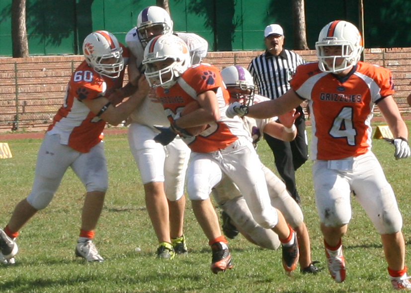 La seconda giornata del campionato High School vede i ragazzi di coach Giannelli conquistare la loro prima vittoria: contro i Ravens Imola, fra le mura amiche dello Stadio Paolo Rosi, gli orsetti riescono a superare i Ravens Imola a pochi secondi dalla fine, dopo essere stati in svantaggio per tutto l’incontro. Partivano, infatti, subito bene gli ospiti che costringevano, i padroni di casa all’interno della propria metà campo per tutto il primo quarto di gioco. Gli ospiti si rendevano pericolosi con le corse di Cattabriga ed i precisi lanci di Ferraraccio per Raffini e Berti; era proprio quest’ultimo, allo scadere del quarto, a portare in vantaggio i suoi raccogliendo l’ovale all’interno della end zone avversaria; ci pensava poi Morara ad arrotondare sullo 0-7 piazzando l’extra point fra i pali. Nel secondo quarto la difesa capitolina inizia a prendere le misure limitando le folate offensive, ma un punt degli imolesi arrivava intoccato in prossimità della goal line dei padroni di casa costringendo i Grizzlies ad un primo e dieci praticamente sulla linea della propria meta; gli orsi sembrano riuscire a gestire la complicata situazione ma sulle 7 yards una incomprensione fra Richard ed il suo running back consentono all’imolese Errani di impossessarsi della palla. I Ravens raddoppiano con una corsa di Cattabriga e l’extra point di Morara portandosi sul 14 a 0. A 4 minuti circa dal riposo l’offense dei Grizzlies inizia finalmente a produrre gioco e conquistare yards: una bella ricezione di Cinque ed una serie di corse di Crevatin portano i padroni di casa a ridosso della end zone avversaria dove Sciarra realizza con una corsa di 6 yards e Cunningham jr. piazza la palla fra i pali per il 7-14 con il quale le squadre vanno negli spogliatoi.