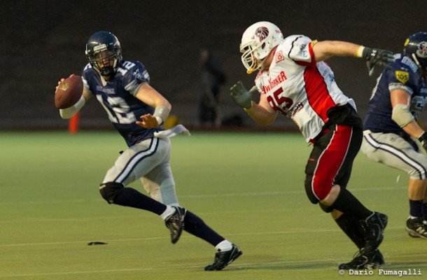 «Nel 2012 abbiamo avuto un calendario molto duro, reso ancor più difficoltoso dall’impegno europeo. Se ci mettiamo anche la morte del nostro grande coach Joe Avezzano si può parlare come minimo d’inizio difficile! Poi abbiamo messo insieme una buona serie di vittorie, ma con gli infortuni di Anthony Di Michele e del sottoscritto, nella partita contro i Daemons, terminata con una sconfitta, le nostre speranze di playoff sono sfumate. Per quanto mi riguarda ho impiegato un po’ ad abituarmi al football italiano, ma con il passare del tempo mi sono sentito sempre più a mio agio. Tirando le somme la scorsa stagione è stata deludente perché il nostro obiettivo era entrare nei playoff e vincere il derby e non siamo riusciti a fare nulla di tutto questo».