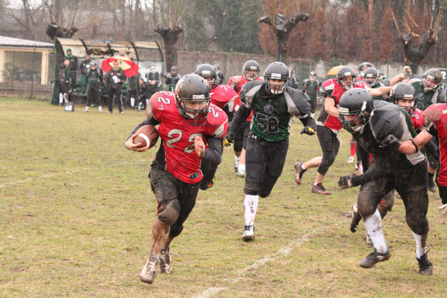 Maltempo spesso protagonista nelle partite della quinta giornata del campionato di football a 9. Ciò non ha impedito di vedere un bel football, grazie alle difese che in più di un’occasione sono state protagoniste e al gioco di corsa che molte squadre hanno dovuto scegliere. Due vittorie esterne negli anticipi del sabato. Spicca quella dei Bills Cavallermaggiore, che a La Spezia travolgono i Wolfpack 47-0 nonostante alcune assenze e mettendo in mostra, oltre all’attacco, anche una buona difesa grazie alla superiorità fisica sugli avversari. I Bills restano dunque a punteggio pieno, come le Aquile Ferrara, che vincono 20-7 in casa dei Knights Persiceto. Gara indirizzata subito con i touchdown di Malta e Mantovani (che ricopre una palla persa e la riporta in endzone) nel primo quarto. 13-0 all’intervallo lungo, poi Mingozzi ancora per Ferrara e Belinelli per Persiceto chiudono i conti nel secondo tempo. Ma la partita è stata molto più tirata di quanto non dicano il punteggio e l’andamento delle segnature e Ferrara l’ha vinta grazie alla resistenza della sua difesa su un campo reso pesante dalla pioggia. L’unica vittoria interna del sabato viene ottenuta dai Pirates Savona in una gara altrettanto equilibrata contro i Predatori Golfo del Tigullio, che cedono 12-0. I touchdown di Castagnola e Montuori, entrambi non trasformati, arrivano nella prima parte di una partita dove il gioco semplice ma ben eseguito dei padroni di casa si è rivelato efficace e ha dato ai Pirates l’atteso riscatto.