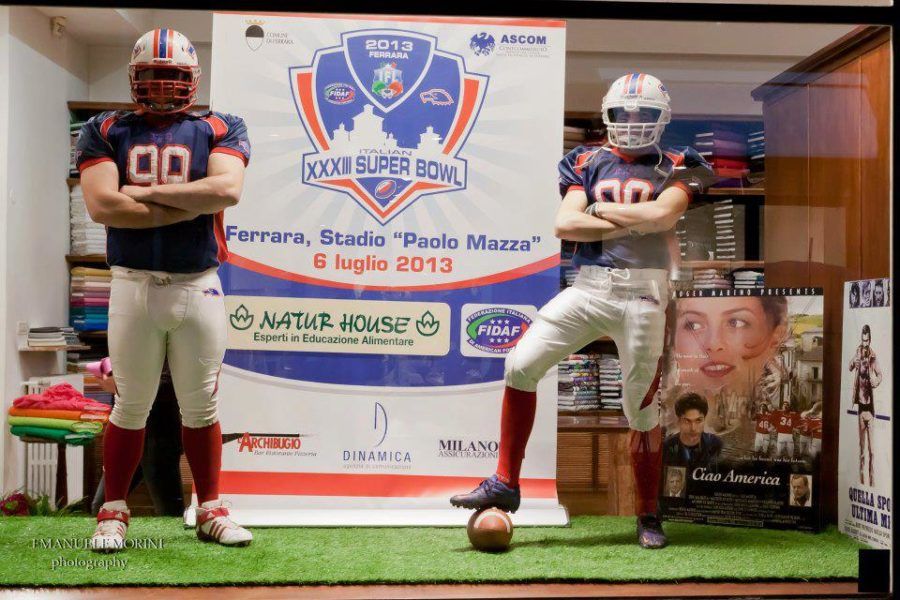 Non è stato solo un week end di successi sportivi quello appena trascorso, per la Dimedia Aquile ma anche una occasione per partecipare all’iniziativa “Vetrine in movimento”, organizzata dal Comitato commercianti del centro storico e che ha visto coinvolti un’ottantina di negozi. L’iniziativa quest’anno, in omaggio alla figura di Michelangelo Antonioni il cui talento è celebrato nella grande mostra al Palazzo dei Diamanti “Lo sguardo di Michelangelo. Antonioni e le arti”, aveva come tema il cinema. Anche le Aquile hanno voluto dare il loro contributo alla manifestazione ed in particolare hanno animato la vetrina del negozio di Felloni Abbigliamento, di proprietà di Giulio Felloni primo storico presidente del sodalizio ferrarese. L’omaggio di cinematografico che la vetrina del negozio, animata da due atleti delle Aquile Ferrara in tenuta da gioco, era ben sottolineato da due film che in forma diversa fanno del football americano il loro punto focale. Il primo è un film di caratura internazionale “Ogni maledetta domenica”, del 1999 di Oliver Stone, che vede Al Pacino nei panni di un allenatore di football americano e che per gli atleti di questo sport rappresenta l’essenza dello spirito che dovrebbe permearlo. Di questo film ogni giocatore di football americano ha visto e ricorda il discorso che l’allenatore Tony D’Amato (Al Pacino) fa alla squadra prima del match e che nella frase finale riassume lo spirito che anima gli atleti “ogni maledetta domenica si può vincere o perdere l’importante è vincere o perdere da uomini”. Il secondo cartellone che caratterizza la vetrina animata dalle Aquile è vicina alla realtà della squadra e della città ed è il fim “Ciao America” film del 2002, diretto da Frank Ciota e realizzato in collaborazione con il fratello Joe, quest’ultimo allenatore delle Aquile nei primi anni ’80. Il film racconta attraverso l’esperienza di Lawrence Primavera un italo-americano uno spaccato della storia delle Aquile e della Ferrara di quegli anni. La pellicola ha visto la partecipazioni di attori famosi come Giancarlo Giannini, Maurizio Nichetti e Violante Placido. Il film è sicuramente una parte della storia del football americano in Italia, storia che ha visto la squadra delle Aquile protagonista fin dalla nascita. La partecipazione a questa iniziativa è l’ulteriore segno di una volontà di interazione con il tessuto sociale che la società ha voluto lanciare e che unitamente alle iniziative con le scuole ferraresi e alla Football Academy che tutti i sabati accoglie, nel campo di via Veneziani, ragazzi che vogliano avvicinarsi al football americano, rappresenta il segno concreto del rapporto con il territorio