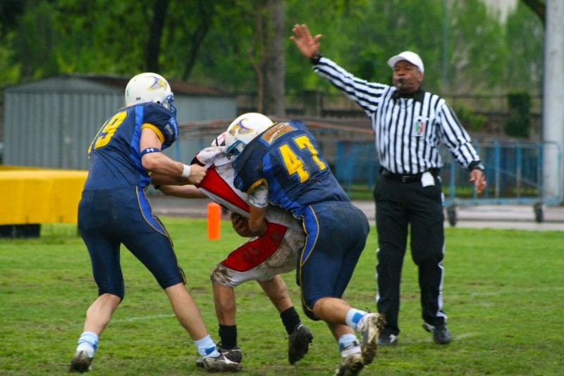 E sono quattro! Quarta vittoria consecutiva per gli Agsm Mastini Verona e primo posto in solitaria nel girone F. Una gara difficile quella contro i Saints Padova, che ha comunque meritatamente premiato i gialloblù del presidente Simone De Martin. Dopo il calcio d’inizio simbolico del vicepresidente di Agsm Mirco Caliari, la partita inizia subito con una doccia fredda. Un lancio dei gialloblù viene toccato e deviato nelle mani del linebacker patavino Borgato che si invola in touchdown per i primi sei punti della giornata. Un sei a zero che gela gli animi degli scaligeri per qualche minuto, abili a riprendersi subito con l’intercetto di Roberto Sebastiani. Nella parte iniziale della gara sono le difese ad avere la meglio, trovandosi a fronteggiare attacchi in difficoltà a gestire una palla, resa viscida dalla pioggia. È infatti di nuovo la difesa di coach Ottenio a salire sugli scudi con Petrignani a recuperare palla. Arriva così il touchdown degli Agsm Mastini con una splendida corsa dell’ex di turno Mattia Capogrosso. Calcio a segno e punteggio che si fissa sul 7 a 6 per i gialloblù. Nel secondo quarto di gioco i Saints vanno a segno con un field goal portandosi nuovamente avanti per 9 a 6, mentre i Mastini non riesconno a sfruttare altre due palle recuperate con gli intercetti di Filippo Mutascio e “Tex” Tomelleri. Nella seconda parte di gara l’attacco di coach Maggini ingrana la quarta con le corse di Pasquetti e Alessandro Sebastiani e le ottime ricezioni di Zanini e Fiorini. Ma si deve aspettare l’ennesima palla recuperata dalla defense gialloblù con Gualdi per vedere il touchdown del sorpasso. Pasquetti cambia lo schema sulla linea, in un quarto tentativo cruciale, e imbecca perfettamente Capogrosso per il touchdown del sorpasso che fa esplodere di gioia la panchina scaligera. A questo punto i gialloblù sono carichi e la difesa, che già aveva concesso davvero poco sino a qui, è davvero impenetrabile con Brunelli e compagni a bloccare anche un tentativo di field goal dei patavini, e costringendoli in un secondo momento al calcio di allontanamento. Nel quarto quarto di gioco anche i Mastini sbagliano un field goal ma costringono l’attacco dei Saints a lasciare la palla a sole 3 yards dalla goal line. Si incarica Alessandro Sebastiani a varcare la linea per il 21 a 9 che sembra porre fine alla gara. Nel kick off successivo a pochi secondi dal termine, sono invece i Saints ad avere una prova di orgoglio, segnando il touchdown del 21 a 15 finale. Per i gialloblù di coach Michele De Martin è tempo ora di pensare alla prossima gara. Domenica 28 aprile a Verona arriveranno i Muli Trieste.