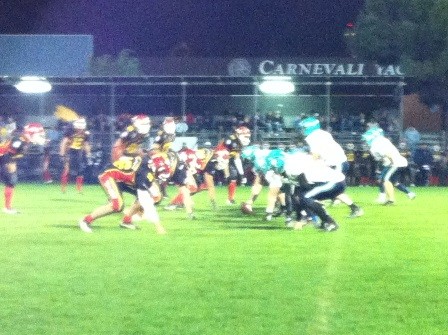 1 quarto: 1’ TD Sportillo pass Nerozzi 35 yards e trasf. Bovo.
