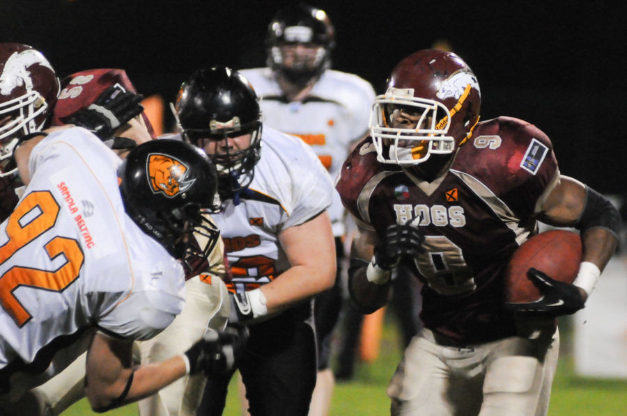 HOGS REGGIO EMILIA-SAMPLA BELTING RHINOS MILANO 21-14 (0-0, 7-0, 0-14, 14-0) – Una bella partita. Anzi no, dicono alcuni di quelli che l’hanno vista, e da vicino. Beh, non siamo d’accordo. Ci saranno stati tanti errori (ben 5 intercetti subiti da Chris Forcier, quarterback dei Rhinos, che sono poi però altrettanti intercetti della difesa degli Hogs e dunque qualcosa di cui i reggiani devono essere orgogliosi), ma quando il risultato è incerto fino all’ultimo possesso di palla della squadra in svantaggio è evidente che parliamo di quel tipo di football – o di sport in generale – in cui il pathos vale più della pulizia di gioco e della tecnica. Certo, lo 0-0 del 1° quarto può averne generata poca, di suspense, ma è meglio non dirlo a Jamail Berry, il safety degli Hogs autore dell’intercetto numero 1 su Forcier. Nel 2° quarto azione identica ma… diversa di Damiano Ligabue, il defensive end reggiano che stoppa il lancio di Forcier, recupera la palla e la porta in end zone per il 7-0 (calcio di Nicolò Iotti). Dopo un altro intercetto, questa volta di Giovanni Caccialupi, non concretizzato dall’attacco degli Hogs sul possesso successivo, il primo tempo si chiude senza altre segnature, ma a inizio terzo quarto i Rhinos sembrano finalmente poter entrare in end zone: Forcier, nel tentativo di farlo, perde però il pallone a mezz’aria, e il recupero da parte dei reggiani permette loro di ripartire con l’attacco dalle 20. I Rinoceronti pareggiano però pochi minuti dopo, con lancio di Forcier per Kadarron Anderson (12 yard più calcio di Alessandro Delaria), e passano avanti 14-7 prima ancora della fine del periodo, con Forcier che valica la goal line con una brillante corsa personale. L’ultimo quarto inizia con il pareggio (14-14) degli Hogs, grazie a una corsa di 50 yard di Sha-ron Edwards: sul drive successivo dei Rhinos la difesa di casa intercetta ancora Forcier sulle proprie 19 con De Jesus, e subito Edwards si mangia le rimanenti 81 yard con una corsa in touchdown che viene poi trasformata da Iotti per il 21-14 finale. Nei 5’ restanti i Rhinos hanno a disposizione ben tre drive per pareggiare, mentre Reggio sbaglia un field goal dalle 29 con Iotti, e sull’ultimo di questi drive è Demetri Huffman, schierato quasi solo come safety (quarterback è stato ancora Marco Lazzaretti per gran parte della gara), a intercettare in end zone. Ora per gli Hogs una interessante trasferta ad Ancona, mentre i Rhinos prenderanno ancora l’autostrada verso il mare, fermandosi 45 minuti prima, a Parma: in entrambi i casi rivincita delle sfide della prima giornata, vinte dagli Hogs e dai Panthers.