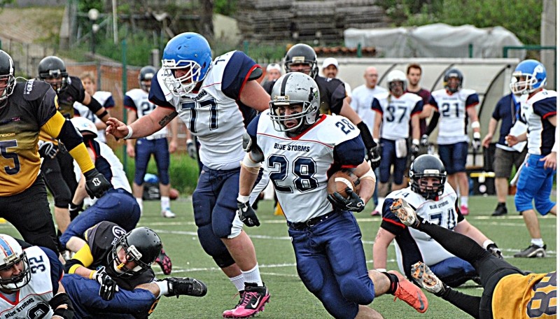 In casa Blue Storms si procede passo dopo passo, come da programma d’inizio stagione: la consapevolezza dei propri mezzi sta crescendo, ma il lavoro da fare è ancora tanto e la parola d’ordine è NON MONTARSI LA TESTA! Se è vero che la vittoria del girone consente agli atleti bianco-blu di saltare il turno di wild card e di concentrarsi direttamente sulla prima partita dei play off, che si giocherà in casa ai primi di giugno, è anche vero che coach Ganci domenica ha perso per infortunio una pedina importante per il suo attacco, il runninback Federico Massironi. Per lui frattura multipla al braccio destro e stagione compromessa. La squadra deve trovare in fretta un nuovo equilibrio in attacco e sistemare il gioco aereo, ancora troppo poco incisivo. Per i play off servirà mettere in campo tutto il proprio potenziale, perché gli avversari non concederanno niente e chi sbaglia…paga con l’eliminazione!