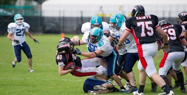 CRONACA: I Saints provano a colpire con le corse cercando di sfruttare la rapidità del running back Fantin, mentre gli Islanders cercano di imbastire qualche bella azione col gioco di passaggi. E al primo possesso ecco la scossa: al5’ dall’affiatato asse Nerozzi-Scaramuzza esce un passaggio di28 yards del quarterback che imbecca il ricevitore. E’ il primo touchdown di giornata, ma anche l’unica vera emozione del primo quarto che scivola via in pieno equilibrio con un’attenta difesa blu teal, autrice anche di un sack sul QB di casa, che tiene a distanza di sicurezza i padovani dalla propria red zone. Il secondo periodo riserva ancora meno emozioni, fatta eccezione per alcune giocate difensive come un intercetto di Cester che innesca il contrattacco Islanders fermato a fatica dai biancorosso-neri. Tanti i passaggi incompleti che impediscono alla gara di decollare.