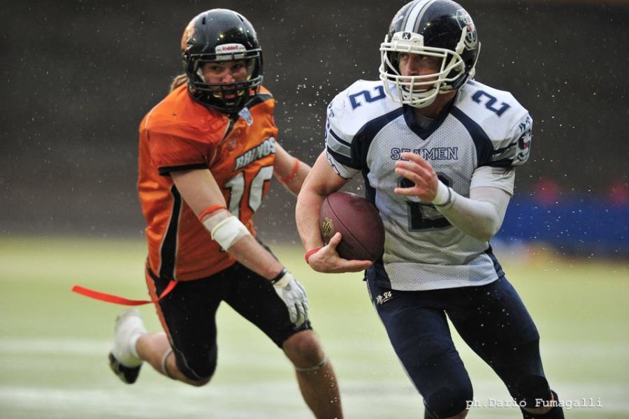 SAMPLA BELTING RHINOS MILANO-SEAMEN MILANO 12-13 (6-0, 0-0, 6-7, 0-6) – Drammatica partita al Vigorelli, che pare fortunatamente vicino al rifacimento del campo di gioco sintetico, anche sabato reso insidioso dalla pioggia. Seconda vittoria dei Seamen nei derby 2013, con la conseguenza che avete già letto, ovvero Marinai sicuri almeno del secondo posto e di un ambitissimo turno di playoff in casa, Rinoceronti costretti a vincere tutte e due le gare rimanenti. Per i Rhinos un’altra partita produttiva dal punto di vista dell’andamento e delle cifre ma con errori che hanno spostato il risultato, e lo si capisce studiando la cronologia della partita, giocata di fronte a 1000 spettatori. Assente il quarterback Chris Forcier, infortunatosi la scorsa settimana a Parma, il titolare è ancora il 22enne Giovanni Silva, che viene alla fine intercettato due volte, ma non senza essersi reso protagonista di alcune buone giocate. Il vantaggio è proprio dei Rhinos con AJ Storms, chiamato a giocare running back con maggiore frequenza, in alternanza con l’ottimo Mattia Binda, per dare una mano a Silva: l’ex leader di Idaho State corre per 28 yard, dopo un ritorno di punt di Chauncey Calhoun che dà all’attacco un primo down proprio sulle 28 offensive, ma la trasformazione su calcio è sbagliata (6-0, 2’09” alla fine del primo quarto). Nel secondo periodo per due volte la difesa dei Rhinos ferma i Seamen a una yard dalla end zone, nel secondo caso dopo un intercetto di Filippo Turrin sulle 27 difensive, e dopo un intercetto di Shawn Abuhoff ancora i Marinai non trovano il tempo di mettere in pericolo il vantaggio dei cugini. Nel 3° quarto subito un colpo di scena: snap difficoltoso, Silva non riesce a controllare la palla, che rotola e viene infine raccolta dal defensive end dei Seamen Matteo Pegoraro, che la riporta in end zone per 63 yard. Il calcio di Stefano Di Tunisi porta al 7-6 per gli ospiti a 9’30” dalla fine del terzo periodo, ma il punteggio cambia poco dopo grazie a uno sprint di Binda per 8 yard preceduto da uno slalom di Storms per 65, ma la trasformazione da 2 punti non riesce e il punteggio è 12-7 Rhinos a 6’24” dalla fine del 3° quarto. Nell’ultimo periodo di nuovo un cambiamento di risultato, con il td pass di Jordan La Secla per Gianluca Santagostino, 24 yard. Niente trasformazione e 12-13 a 10’54” dal termine: dunque molto tempo, nel quale i Rhinos commettono un errore sullo snap per un punt, con palla ai Seamen sulle 19 offensive a 3’45” dalla fine. Calhoun intercetta sulle 5 a 2’13” dalla fine riaccendendo le speranze dei padroni di casa, che però non si traducono in realtà per via di una difesa Seamen pronta alle soluzioni escogitate dai Rinoceronti.