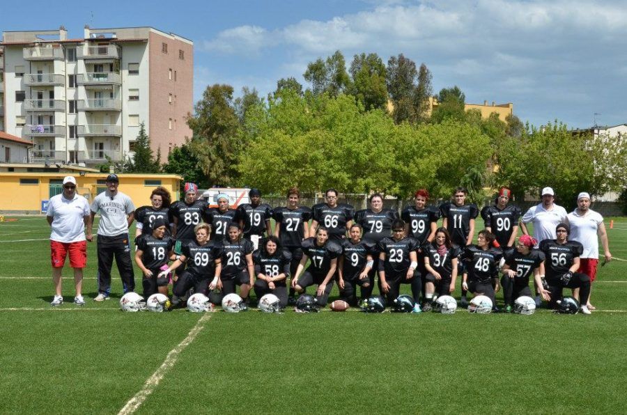 In un pomeriggio ideale per scendere in campo, allo Zanni di Pescara, le ragazze dei Coach Golfieri e Orlandi hanno fornito un’ottima prova, dominando l’incontro che le vedeva opposte alle ragazze del team di Gorla Minore Sirene/Tempeste, alla ricerca della loro prima vittoria e quindi determinate a contrastare la forza delle ragazze di casa Aquile. Ma questa terza giornata di questo primo storico campionato ha visto le blackMarines in grande forma e decise a proseguire nel modo migliore il loro cammino verso lo storico traguardo del primo Rose Bowl, in programma a Ferrara il 6 luglio nell’ambito delle manifestazioni del XXXIII Italian Super Bowl. La partita che ne è scaturita è stata dominata dalle blackMarines e il perentorio 33 a 0 con cui si sono imposte ne è una chiara testimonianza. Le ragazze hanno imposto sin dall’inizio del match il loro ritmo e hanno indirizzato l’inerzia dell’incontro concludendo in touchdown il primo drive con una corsa di Valentina Rizzuti, che completata dalla trasformazione di Giulia Fanella, su lancio del QB Valentina Valieri, ha fissato il risultato sul primo parziale di 7 a 0. A supporto di questo brillante inizio dell’attacco ha fatto riscontro una prova di grande forza della difesa che ha contenuto l’offense del team delle Sirene&Tempeste dentro la loro metà campo, senza concedere nessuna possibilità di gioco alle avversarie. Il ritorno in campo dell’offense estense/romana è stato nuovamente coronato da un drive concluso con un secondo TD realizzato con un ottima ricezione di Giulia Fanella raggiunta in end Zone da un lancio della QB Valieri per il 14 a 0. A questo punto è ancora la difesa a dominare l’attacco avversario sfiorando anche il turnover, andando vicino ad un intercetto con la safety Mariam Battistelli. Nel successivo drive a conclusione del primo tempo l’attacco blackMarines prova un gioco veloce per aumentare il vantaggio ma non riesce per il poco tempo rimasto alla conclusione del primo tempo, chiuso in vantaggio per 14 a 0. La ripresa vede la partita ricominciare sullo steso binario con cui si era sviluppata nel primo tempo e il primo drive offensivo vede nuovamente una splendida prova dell’attacco e si conclude con un TD della WR Lucia Taddia, che segna dopo aver ricevuto un lancio da oltre 40 yds dal QB Valieri, che nella giornata del suo rientro sfodera una grande prova che ha dato ritmo ed incisività all’attacco. A sottolineare questa ottima prova arriva anche extra point di Noemi Palazzi sull’ennesimo passaggio completato dal QB e risultato che diventa 21 a 0. La difesa continua a dominare e l’attacco prosegue nella sua ottima giornata e così i successivi drive di attacco si concludono con altri due TD; il primo realizzato da Chiara Mingozzi, con una splendida corsa e il secondo, quinto della giornata, con una spettacolare ricezione in tuffo di Noemi Palazzi, ottima anche la sua prova, su lancio del QB Valentina Valieri. La partita si conclude sul 33 a 0 e con le ragazze e i coach ovviamente contenti e fiduciosi per il prosieguo del torneo. La vittoria porta anche il primato in classifica anche in concomitanza della sconfitta, nella successiva partita, delle Furie per 25 a 19 ad opera della squadra di casa delle Lobsters Pescara. In attesa dei prossimi incontri la classifica vede in testa blackMarines e Lobsters, con 2 vittorie e 0 sconfitte, seguite dalle Furie, con 2 vittorie e 1 sconfitta,