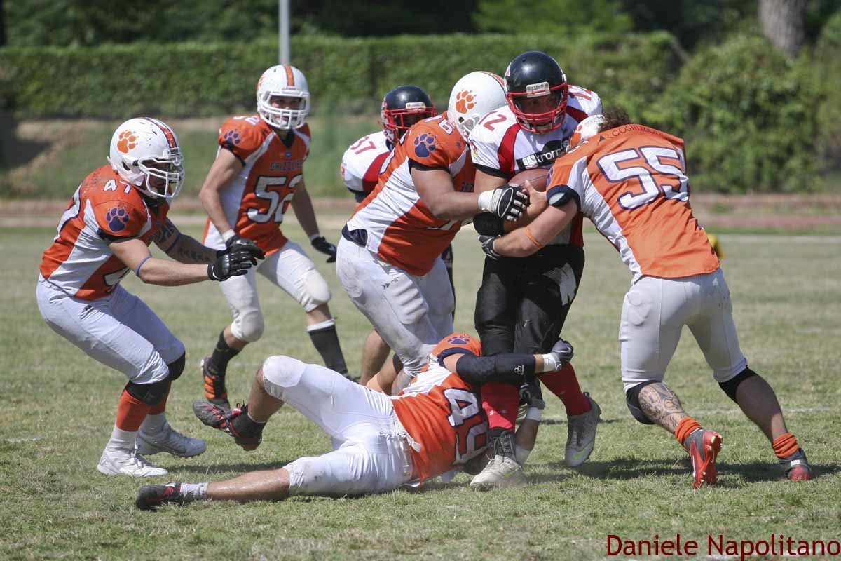 Domenica a Roma alle 14.00 scendono in campo Grizzlies e Elephants, re-match di Week 8 in cui vincensero i Romani sempre in casa: partita molto combattuta, yard su yard, con le difese a dettare legge in campo, anche se al primo possesso degli Elephants, dopo un 3&out dei Grizzlies, i ragazzi di Coach Giuliano sorprendono la difesa capitonlina giocando un Fake Field Goal su un 4 e lungo che vede il WRBarbagallo lanciare a Mangano direttamente in endzone, la trasformazione è buona e il risultato si sposta subito sul 0-7. La reazione degli Orsi inizia con un bel ritorno di Vieira, capitalizzato poi dal Field Goal di Bianco che chiude il primo quarto; inizia il grande lavoro delle difese, che porta a uno scambio di punt per tutto il secondo quarto, quando a quasi 2 minuti dal termine, senza timeout, i Grizzlies in attacco giostrano un gran drive che li porta grazie al sistema ‘No Huddle’ e alle ricezioni di Bianco, Cinque, Bertocchini, Cingolani, a calciare un Field Goal a 9 secondi dalla fine con Bianco ancora perfetto. Squadre negli spogliatoi sul 6-7. Al rientro in campo la partita prosegue con lo stesso andamento, le difese infatti continuano a chiudere tutte le porte sulle iniziative avversarie; dopo alcuni drive di cambio possesso sono gli Elephants che provano a chiudere un quarto down e neanche una yard da conquistare, ma il muro capitolino no lo permette. Con il turnover on downs l’attacco romano si galvanizza e riesce a portarsi a raggio di Field Goal per provare a passare in vantaggio, Bianco è di nuovo perfetto e porta avanti i Grizzlies sul 9-7. Inizia sempre di più a pesare quindi il duro lavoro delle difese, a cercare di girare il ‘momentum’ a favore dei Catanesi ci prova Mangano che riesce a recuperare un fumble romano, ma l’attacco non concretizza, ci pensa Lolli infatti a intercettare un passaggio di Conticello, entrano Ianniello&Co che riescono a guadagnare terreno e far passare un po’ di tempo, ma senza portare a casa punti. Con due minuti da giocare gli Elephants iniziano in attacco dalle proprie 20 yard, tentano il drive finale della vittoria, ma il lancio lungo di Conticello viene intercettato da Dula, e con ormai pochi secondi alla fine i romani devono solo inginocchiarsi e portarsi a casa la seconda finale LeNAF consecutiva!