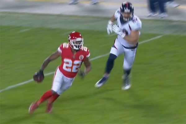 - Jamaal Charles, dei Broncos, torna a Kansas City dopo nove anni passati con i Chiefs: durante la sua prima corsa i suoi ex compagni lo salutano e lui se ne approfitta involandosi indisturbato per 20 yard.