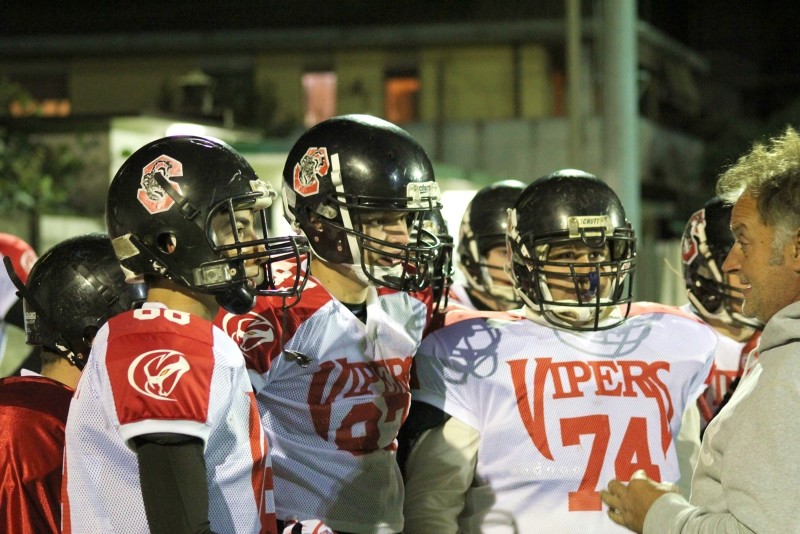 Busto Arsizio, 31 ottobre 2012 – Serata di grandissime emozioni quella di sabato sera al campo del quartiere Beata Giuliana di Busto Arsizio, sede ufficiale delle partite casalinghe dei Vipers Varese. Si giocava la terza partita del Campionato Italiano High School e le due formazioni in campo erano entrambe reduci da due sconfitte consecutive: voglia di riscatto e tanta grinta hanno avuto la meglio sul bel gioco, ma il risultato alla fine premia i Vipers Varese, che si aggiudicano il primo match della loro storia con un risicato 28 a 26. Veniamo al racconto della partita. Le condizioni meteo, con tanto freddo e un vento insistente e fastidioso, non hanno scoraggiato una discreta presenza di pubblico. Sugli spalti, anche l’allegria e la grinta delle Tempeste, neonata formazione femminile di football americano targata Blue Storms. Sul campo, invece, per la prima volta i Vipers hanno potuto contare anche sul tifo delle Thunder Cheers, il gruppo di cheerleading che seguirà tutte le formazioni del team bustocco in questa stagione. Il primo quarto ha evidenziato da subito qualche piccola falla in difesa, apparsa un po’ meno solida rispetto alle due precedenti partite: troppo spazio concesso ai Rhinos, soprattutto sui lanci, e troppi placcaggi rotti che hanno consentito ai milanesi di portarsi subito in vantaggio. Paradossalmente, il reparto difensivo ha invece retto sempre bene nei momenti critici, soprattutto quando la palla era ferma a pochissime yard dall’end zone e questo ha consentito ai Vipers di annullare praticamente ogni tentativo di trasformazione dei Rhinos, situazione che alla fine ha deciso il match. Tutto l’incontro si è giocato in perfetto equilibrio: dopo il primo TD milanese, i Vipers rispondono immediatamente con un kick off return direttamente riportato in meta da Marco Facetti e con una trasformazione da 2 punti su corsa ad opera di Christian Sottura (uno dei protagonisti di questo incontro). I Vipers passano dunque in vantaggio, ma vengono riacciuffati subito dopo dai Rhinos che, tornati in attacco, vanno subito a segno. Di nuovo la difesa varesina blocca il tentativo di trasformazione e il risultato si attesta sul 12 a 8. I ragazzi di coach D’Alessandro tornano in attacco e segnano un bel TD su lancio di Giacomo Micheli per una ricezione di Lamberto Giorgetti. Michele Tovaglieri (non proprio una grande serata la sua..) sbaglia il field goal e le squadre vanno negli spogliatoi per l’intervallo di metà partita sul punteggio di 14 a 12 per la formazione di casa. Il tè caldo e la consapevolezza di potersi finalmente aggiudicare la prima vittoria della loro storia, danno la carica ai Vipers, che tornano in campo e vanno subito a segno con una bella sweep di Christian Sottura. Ancora a vuoto il calcio di trasformazione e 20 a 12 il risultato. Il gioco torna lacunoso, con prestazioni altalenanti sia in attacco che in difesa, difesa che riesce a contenere per ben 2 volte 4 tentativi da 1yd dei milanesi, ma poi si fa fregare nel 4° quarto su un lancio che riporta i Rhinos in end zone. Niente trasformazione anche per i rinoceronti, che si avvicinano pericolosamente al pareggio. E qui succede quello che non ti aspetti: l’attacco varesino riparte dalle proprie 2 yds e la difesa dei Rhinos riesce a placcare in end zone il runningback Kostantin, mettendo a segno una safety, che regala due punti e il pareggio ai Rhinos. Pubblico sugli spalti in fibrillazione, giocatori in campo pure….non si sblocca il risultato e si va all’overtime, dove il regolamento prevede un drive a testa per tentare di andare in meta. Partono i Rhinos dalle 25 yds e colpiscono la difesa varesina nel suo punto più debole: i lanci. I milanesi segnano e si portano in vantaggio: 26 a 20! Tocca ai Vipers tentare il recupero….e i ragazzi ci provano sul serio, portandosi con sole due corse in prossimità dell’area di meta. Christian Sottura non tradisce e con un’altra corsa esterna va a segno: 26 a 26!! Se non trasformano, si resta in pareggio e l’overtime continua….ma i Vipers non ci stanno e giocano il jolly: Giacomo Micheli (QB) con una finta corsa lancia su Ivan Fonti direttamente in End Zone per la trasformazione da 2 punti che chiude la partita con un vittorioso ma stretto risultato di 28 a 26! Alla fine, questo il commento dell’ head coach dei Vipers, Alessandro Di Lorenzo: “Partita dura… con troppi rimpalli; attacco migliorato ma ancora poco convincente nei momenti clou… difesa troppo altalenante rispetto al solito. Ma questa volta abbiamo visto molto più spirito combattivo da parte dei giocatori e tante emozioni per il pubblico: una partita al cardio palma!!!!