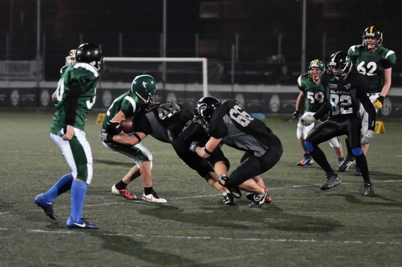 I° Quarto: Vinto il sorteggio e palla alla Offense Blacks. Una option è il primo gioco chiamato dalla panchina di casa ed è Gabriele Maritano ad aprire le marcature con una corsa di 32 yards. Mancava la try Matteo Deninno, ma dopo pochi secondi già il tabellone segnava 6 – 0. Un avvio di gara che creava qualche problema agli ospiti anche perché la difesa di casa concedeva veramente poco agli avanti avversari. Blacks ancora a segno con una corsa di Matteo Montenero e successiva trasformazione ancora su corsa di Tamsir Seck per il 14 – 0. Non riuscivano a concretizzare il gioco i Predatiri ed era Lorenzo Cazzamani che macinava gioco e lanciava in T.D. Gabriele Maritano; ancora su pass la try, ma Emanuele Starace droppava una palla non facile ed il punteggio era ora 20 – 0. Una difesa Blacks implacabile consentiva ancora alla Offense di entrare in campo sul finire del quarto ed era Emanuele Starace a segnare su corsa il 26 – 0 dato che non riusciva la trasformazione di Alessio Carlucci. II° Quarto: Anche in questo quarto una buona difesa Blacks impediva segnature ai Predatori colpevoli solo di non riuscire a concretizzare buone giocate, più per inesperienza che per errori. Era Alessio Carlucci a segnare su corsa il 32 – 0 e Ludovico Bergamino a calciare tra i pali il 33 – 0. Poi sugli scudi le difese con un Sack di Matteo Deninno insieme a Riccardo Maritano per i Blacks ed un intercetto riportato per 10 yards da Nicolò Rolleri dei Predatori. Sul finire del quarto ancora Predatori caparbiamente avanti alla ricerca di una segnatura, ma era ancora Matteo Deninno a placcare il Q.B. avversario ed il punteggio di 33 – 0 mandava negli spogliatoi le squadre.