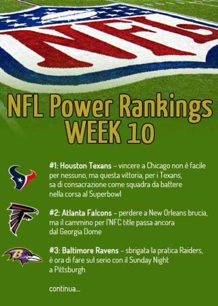 I power rankings di Touchdown.it di questa week 10 danno gli Houston Texans sul podio, seguiti dagli Atlanta Falcons e dai Baltimore Ravens.