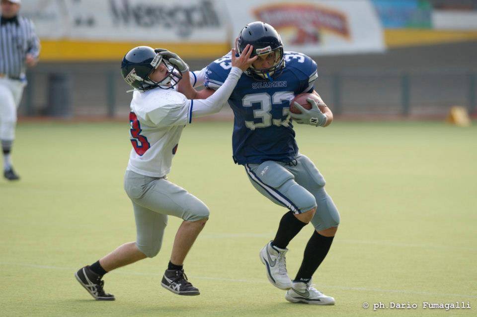 Meno uno alla meta. I Seamen festeggiano l’ennesimo “filotto” della stagione regolando a domicilio, nella categoria under 18, i Giants Bolzano (38 a 20) e “on the road” i Frogs Legnano (0 a 46) nel turno proposto dal campionato under 21. Incamerata la perfect season, parliamo ovviamente di stagione regolare, del team High School resta ora l’ultimo ostacolo, rappresentato dai campioni d’Italia uscenti, gli Hogs Reggio Emilia, per raddoppiare la soddisfazione consegnando agli archivi un risultato sontuoso. Se la classica andata in scena contro i Frogs, fanalini di coda della conference, si è presto trasformata in una cavalcata, nonostante il riposo cautelativo di diversi titolari, il big match giocato al Vigorelli con i Giants, seconda forza del girone est, ha riservato qualche emozione in più non fosse altro per la qualità tecnica espressa dall’avversario. Trascinati in attacco dal duo composto da Alessio Cavallini e Pietro Stillitano, in costante crescita, i marinai hanno alternato giocate brillanti a repentini cali di concentrazione che sono costati, sia comunque dato merito alla volitiva Bolzano, il secondo e il terzo touchdown degli ospiti. Che la partita abbia mantenuto fede alle aspettative lo dimostra il nervosismo emerso tra entrambe le file in termine di gara quando la Milano blue navy ha saputo espandere il vantaggio fino ad un massimo di 24 punti chiudendo ogni varco alle residue velleità degli alto atesini. In attesa di conoscere l’ultimo risultato l’attenzione sarà ora imperniata sulla fase decisiva del torneo che eleggerà le quattro finaliste che il 23 dicembre si contenderanno due titoli nazionali al Vigorelli. A completare il week end si segnalano le buone quanto sfortunate prestazioni di Seamen e Sailors, versione tackle five, che a Parma sono incorse in una duplice sconfitta, con un punto di scarto, contro le emiliane Panthers e Warriors.