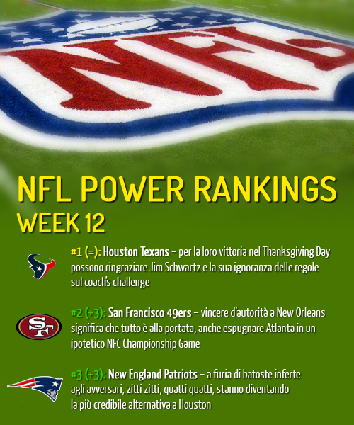 Week 12, ecco i Power Rankings della NFL con in testa gli Houston Texans seguiti dai San Francisco 49ers e dalla new entry New England Patriots.
