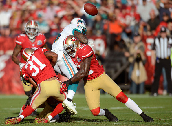 Il tempo passa e non accade niente fin oltre la metà del primo quarto, quando Miami in possesso dell’ovale prova ad imbastire un attacco degno di nota. La scelta di far correre Reggie Bush è quasi un obbligo, tuttavia anche un paio di ottimi completi per il WR Bees portano i delfini nel territorio dei niners e già in raggio da field goal. Qui entra in gioco la difesa dei 49ers che riesce proprio a concedere solo i 3 punti, grazie anche ad un sack di Aldon Smith (in procinto di battere il record di franchigia per sack) che ricaccia indietro Miami.